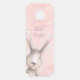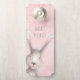 甘いベビードアハンガーと水色のバニーのまわりにウサギの角を覗き、ピンクとグレーの水色の背景。「Quiet Please」という単語をベビーの名前に変更するか、別の単語またはフレーズを選択する。