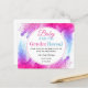 予算の赤ん坊シャワーまたはジェンダーが招待を明らかにする。青とピンクの水の色のインクのスプラッシュの背景には、ピンクに囲まれた白い円が縁ど、ベビーの姓とジェンダーの明かりを含むタイポグラフィ文字。完全なイベントと詳細を前面連絡と背面に追加してパーソナライズ。