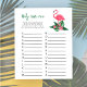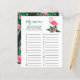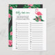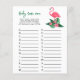 赤ちゃんシャワー招待デザインは、緑豊かな緑のヤシの葉の葉の葉と熱帯ハイビスカスの花とピンクのフラミンゴを特徴とする。「アロハベビー」。黒い背景色のトロピカルフローラルパターンがカードの背面に着く。