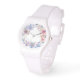 美しいピンク、青とラベンダーの手の絵を描水の色の花がこの時計の外側を囲んでいる。