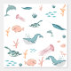 美しいカラフル水色海海動物パターンデザイン。ウミガメ、クジラ、イルカ、クラゲ、魚、ナウラル、海草、サンゴなど可愛い海獣を特徴とする海生物デザイン。海の動物、水彩イラスト、海をテーマにしたデザインを愛するすべての人のための理想的なデザイン。