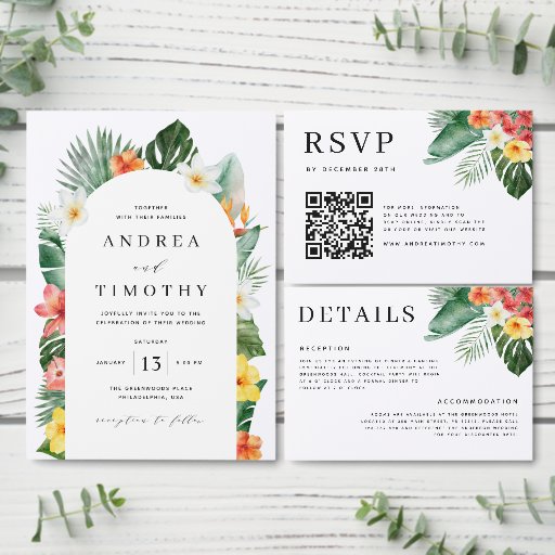 披露宴と宿泊施設の詳細から成る熱帯の夏のテーマのエレガントな結婚式の詳細のエンクロージャカード。