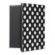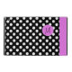 iPadフォリオスタイリッシュスタイルケース内蔵スタンドで黒と白の水玉模様で行う。明るいピンクのバンドランニングは、右の前縁の下にと真ん中の正面に明るいピンクのディスクは、パーソナライズする準備ができている黒い1文字のモノグラムを持っている。ギフト素晴らしアイディアパーソナライズされた。