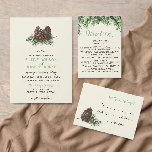 このパイン素朴コーン冬の結婚式の招待状は、松の感じと素朴なコーンと一緒に林を持つ、バックに追加のモノグラムは、あなたの素朴な完璧なモミに見える