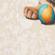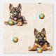 水の色ドイツの羊飼いの子犬は、テクスチャクリームの背景にボールと骨を持つ。
