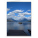氷河の国立公園写真。豪華な湖、山、青い空と雲の中のボートとデッキ。