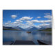 氷河の国立公園写真。湖、青い空、白い雲、山、ボートとデッキの景観写真。
