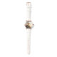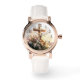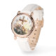 白いレザーストラップとバラ金ゴールドケースを備えた美しいデザインの腕時計。時計の顔は、柔らかいパステルカラーの空に向かって鮮やか、花々の配列に囲まれた木製の十字架の穏やかで美しいシーンを備えている。時計の数字はクラシックフォントで、全体のエレガンスと作品のタイムレスな魅力を追加している。この時計は機能的な時計であるだけでなく、平和と静けさを呼び起こす芸術作品でもある。