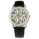 この男性用ウォッチは、オレンジモダン、イエロー、ターコイズ、グレーのダイヤモンドの半デザインを持ち、白いフィールドに散らばった輪郭を描いている。