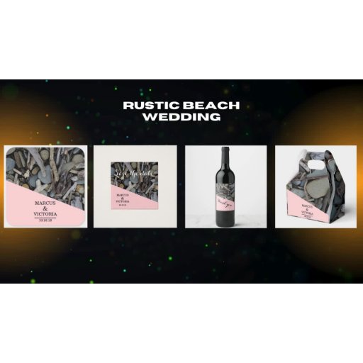花嫁とグルームネームと一緒にカスタマイズ使用できる日付デザインを保存する。背景はピンク色のバナーのコラージュとビーチ石と流木の写真。