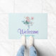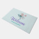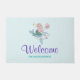 愛らしいイラストレーションのウェルカムドアマット。人魚の女の子がかわいらし幸せなイルカに乗ってデザインされた。小さなクラゲの友人が彼らに同行する。飾(ばちゃばちゃ)跳ねるの少ないフェイク金ゴールドグリッター。淡い青の背景と色あせたピンクの水玉模様。