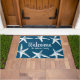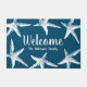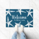 白い原稿の白いヒトデ、白い原稿の"歓迎"の文字、濃紺の背景およびあなたの姓を特色にするBeachy玄関マット! この素晴らしい玄関マットとの夏に歩んで下さい。