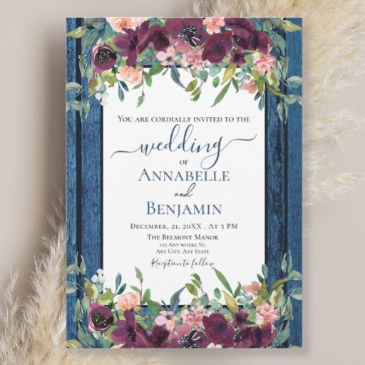 青い木の背景に燃え上がる花を特徴とする美しく素朴なデザイン。ブルゴーニュとネイビーをテーマにしたtouchに最適結婚だ!