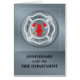 消防署の方の記念日をお祝いします。このカードは銀色の背景に赤い消火栓と軸を持つ丸いバッジを持ち、彼らが行う重要な作業を表しています。 消防署での記念日を祝うのに最適なカード。