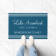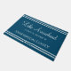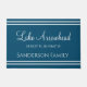湖の名前、家族の名前、マップ座標を持つシックな青と白の枕。レイクモダンハウス,ブラシスクリプト,マップ座標,緯度の経度,