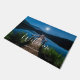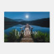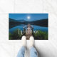 穏やかな湖の上に張り出す木製の桟橋の美しい写真とウェルカムドormat。夜空は星と美しい満月で覆われた。