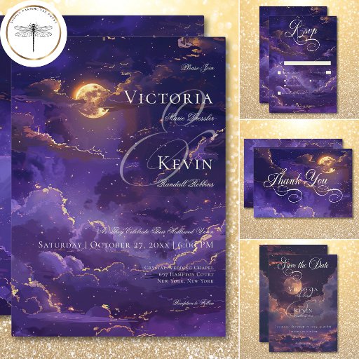 濃いムーディパープル&金ゴールドムーンライトクラウド結婚ズ 招待状