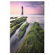 この素晴らしいゲッティイメージズの写真は、緑の苔と海藻の前景とパーチロックライトハウスでの太陽の沈み込みを特徴としている。