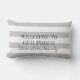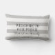 灰色のモダン白いストライプ文字は、私たちのポーチのスクリプトへようこそ、家族名屋外ピローあなたはそれをパーソナライズし、自分の名前を追加することができる。