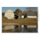あふれる灰色の納屋(春として平和そして平静は開きます) -分野はローカル農場の景色のすばらしい反射を作成します。 緑の木および草、青空、白い家および茶色はすべてをです水の反射葦でふきます。