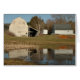 あふれる灰色の納屋(春として平和そして平静は開きます) -分野はローカル農場の景色のすばらしい反射を作成します。 緑の木および草、青空、白い家および茶色はすべてをです水の反射葦でふきます。