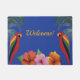 2つの明るいカラフルのパロット、ハイビスカスの花、パームの木の離れバー、ルアウ(ハワイ式宴会)または熱帯風の歓迎マット!「ようこそ」文字の下に名前またはその他の文字をもし追加する。