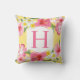 トロピカルスタイルピローデザインは、ピンク鮮やか、イエロー、白のハイビスカスの花の模様と明るいピンクのモノグラム文字と太陽の黄色の背景色が特徴。