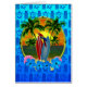 サーフボード、ヤシの木の後ろの熱帯および多彩な海の日没は波板で、コンゴウインコのオウムとまり、ハイビスカスは底で開花します。 青いハワイアンのHonuのウミガメおよび青いtikiのマスクの青い背景。