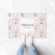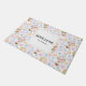 可愛い柄のウェルカムドーお洒落マット熱い気球と星やハートや気球の間の顔とかわいい雲。柔らかいパステルカラーがこの愛らしいデザインを構成する。テキストを内側に配置した上に白い四角。