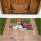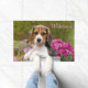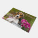 若い子犬目の三色のビーグル犬の子犬はビーグル犬によってが穏やかな気質のscenthound犬の品種である牛乳容器のadmistのピンクの花に坐っています。 Katho Mendenが撮るかわいい小犬の写真。 この写真の印刷のドア・マットは愛犬家のためのギフトのアイディアです。 http://www.zazzle.com/kathom_photo