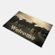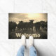 このセピア色のウェルカムドアマットは、牧草地に黒と白の牛のイメージを持ち、その後ろに明るい太陽が付いている。