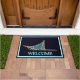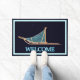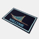 ティール(緑がかった色)のバッグを星空の背景に取り付け、青と白の文字読「WELCOME」を白熱[赤熱]光を放つ付けた犬。このウェルカムマットをカスタマイズするには、スレッドバッグに独自の文字を追加する