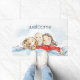 可愛い子犬とその両親のイラストレーション、禿げた男とブルネットの女の姿。君はカスタマイズ文字だ。
