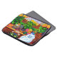 ルイス・ウェインの動物画をプリントしたノートパソコン・スリーブ(1860-1939)。美しい花がたくさんある横に、印象的な青い目をした白猫がどっしりと座っている。背景には、ピンクと青の空の下に猫学園が堂々としている。猫好きやイギリスのアートが好きな人への素敵なプレゼント。