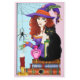 黒い猫が本を積み重ねて座っている紫色の可愛らしい赤い頭の魔女。ピンクを背景にポーション、スパイダー、キャンドル