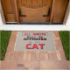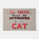 家族や友人は、このドアマットと読このおもしろい際にユーモアのあるくすくす笑う。Welcome モダン guests with 澄ん message: All Guests Must Be Approved By The Cat.黒モダン、赤、白、青のタイポグラフィスタイルおもしろい引用文。茶色のテクスチャで見た背景。