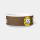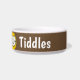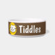 猫が笑顔になる漫画のスタイルイラストレーションが登場するおもしろい器に、ペットの名前を入れる。茶色の背景。