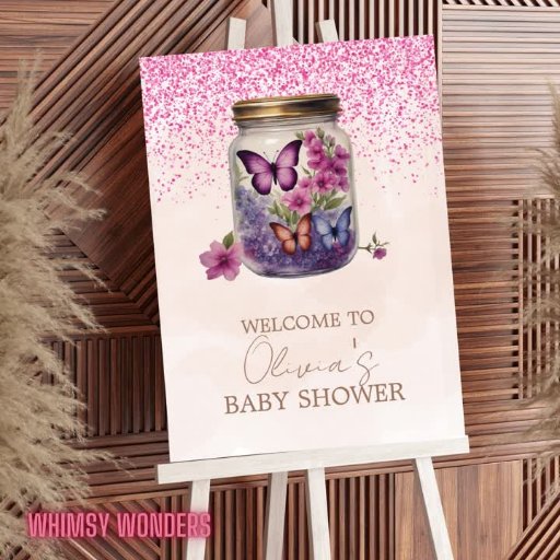蝶ベビーシャワー招待状小さな蝶女の子になる水彩フローラ花ボホお洒落ー・メイソン・ジャー小さな瓶の小さな愛ボホシックな紫の蝶ベビーガールシャワー招待状サマーガーデン金ゴールドグリッターその女の子の赤ちゃんシャワー