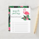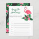 赤ちゃんシャワー招待デザインは、緑豊かな緑のヤシの葉の葉の葉と熱帯ハイビスカスの花とピンクのフラミンゴを特徴とする。「アロハベビー」。黒い背景色のトロピカルフローラルパターンがカードの背面に着く。