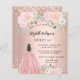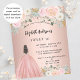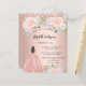 甘モダンい16スタイリッシュ、16歳の誕生日パーティーへの魅力的な招待。バラ金ゴールドの背景に赤面ピンクの花、ボールのガウンを着ている女の子。名前は手書文字のスタイルスモダンクリプト付き。カスタマイズしてパーティー詳細を追加する。1枚= 1枚の招待状を印刷したエッジからエッジ