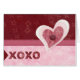 完全にボタンおよび花柄パターンが付いている縫われたX'sおよびO's、ピンクのリボンの、ペーパーまたは布そっくりのハート表示するスクラップブックのスタイルのバレンタインデーの挨拶状。