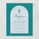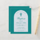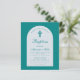 現代的な洗礼の招待状。青い空色の背景に、白いアーチがあり、その中には空色の文字が入っています。洗礼と名前という文字は、優雅な筆記体で書かれており、最初の行はアーチ状のテキストです。