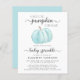 ソフトな灰色のタイポグラフィとスッフレンドリーシュの台本とパンプキンのパステルブルーの水色を混ぜて書「甘い小さなかぼちゃが彼の道にある」とメールで招待され、明るく楽しく予算の多い可愛い男の赤ちゃんを振りかける。母名をカスタマイズし、詳細をグレーのタイポグラフィシンプルで振りかける。