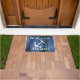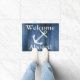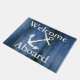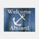 青い木の板を特色にする白い文字のおよび白の航海のないかり"の"を歓迎言う航海のな玄関マット。 家はあなたのいかりを落とすところです。 この素朴な沿岸玄関マットを持つあなたの泊り客で暖かい勧誘印象を作って下さい。