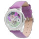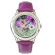 フローラエレガントウォッチ、紫の白いバラと青いアネモネをティール(緑がかった色)の背景にプリントされたピンクの宝石で。