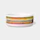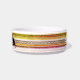 ブラックネームホルダーの両側に白いセラミック猫のフードボウルが2つの猫グラフィックを持っている。背景には、古い外観のグラデーションのストライプがある。両側にはカラーバンドがあり、そのカラーバンドを介して十字型のデザインを持つ。猫のカッコいい器をパーソナライズされた見る。HAMbyWhiteGloveにより設計。