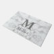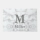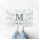 お客様が正しい家に着いたことをお知らせください。家族の名前とモノグラムをグレーの文字で追加できます。背景は白いフェイク大理石です。