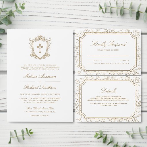 オンラインRSVP用の複雑なエレガント詳細とQRコードを備えた美しいクレストビクトリアンをフィーチャーするこのカトリックの結婚式の招待であなたのゲストを驚かせる。単にイベント詳細をこの使い慣れたテンプレートに追加し、あなたの写真と一緒にこのカードを飾るだけでお気に入りのす。