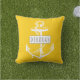 白いヴィンテージいかりとフレームあなたの名航海の前の黄色のリバーシブル屋外ピロー。黄色の白いいかりとフレーム内のあなたの名前が特徴。背中は黄色と白の模様でストライプのある。