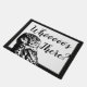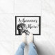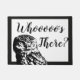 白黒のドアマットに「Whooo's Here?」と書かれたフクロウ 黒い文字で
